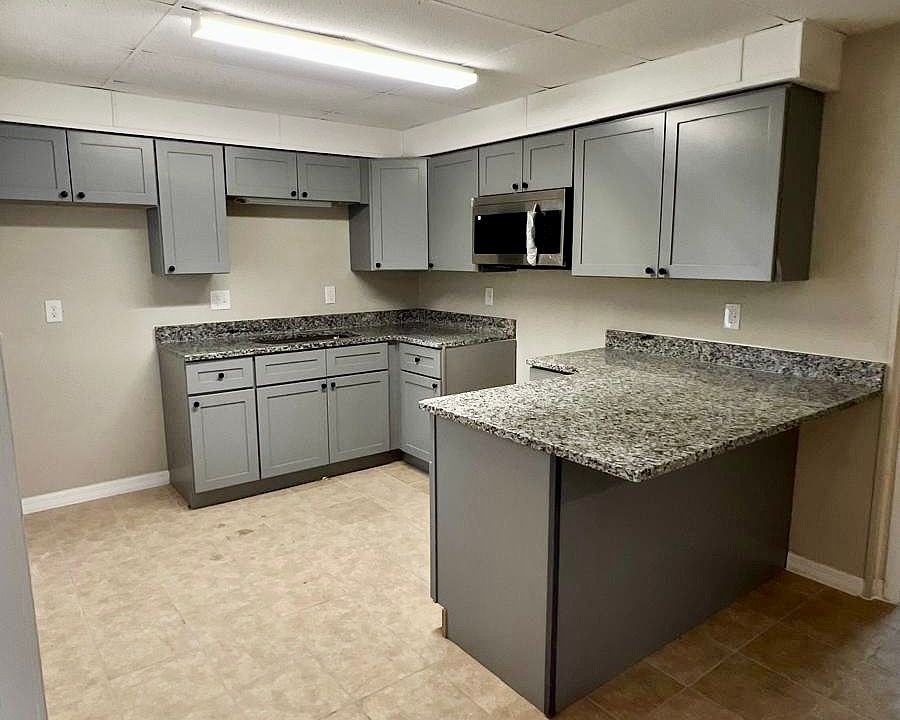Contemporary finishesFreshly renovated homeGranite countertopsThoughtful updatesStylish gray kitchenNewly remodeled bathroomPlenty of cabinet space