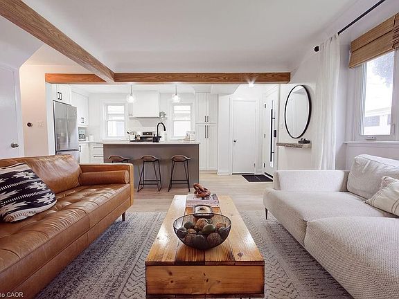 Charming curb appeal in sought after Sunninghill Hamilton Mountain Neighbourhood! Stunning newly renovated home inside and out! This 1-1/2 storey home has it all. Enter through the custom front door with keyless entry to open concept living at its best. Casati Stone custom kitchen offering quartz countertops, Centre island with stainless steel double sink and breakfast bar. Stainless Steel appliances including gas stove. Loads of self-closing cupboard space with spacious pantry. New plank flooring throughout the main level. Recessed wooden ceiling beams adding charm and character. Cozy living area with electric fireplace and spacious dining room. Finishing this level off with an updated 4 piece bathroom and freshly painted throughout! Upper level offers two spacious bedrooms with original hardwood flooring and a brand new walk in closet with built-ins! Notice the new staircase as you enter the lower level with a faux brick feature wall. Cozy recreation room offering extra living space and your own private office with custom built in cabinetry, barn door and pot lighting. Could also be used as a third bedroom. This area also offers a fully renovated 3 piece bathroom with a glassed in shower. Great laundry area with new front load washer and dryer and a separate spacious storage area. Updated light fixtures throughout the home. Windows have been updated as well. The exterior of this home has been professionally painted to give it beautiful curb appeal. New fully fenced yard with deck and bar overhang and a gas fire pit for the cool fall evenings! It also offers a gas line BBQ hook up for convenience! The exterior work was done in 2021 including new sod front and back of the property. The tandem driveway is great for 3 cars plus a massive shed with electrical for all of your outdoor storage needs and a poured concrete area perfect for a hot tub! This home has too many updates to list! Truly a wonderful home and a pleasure to view! RSA