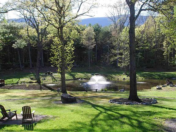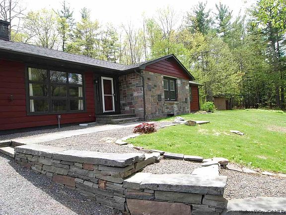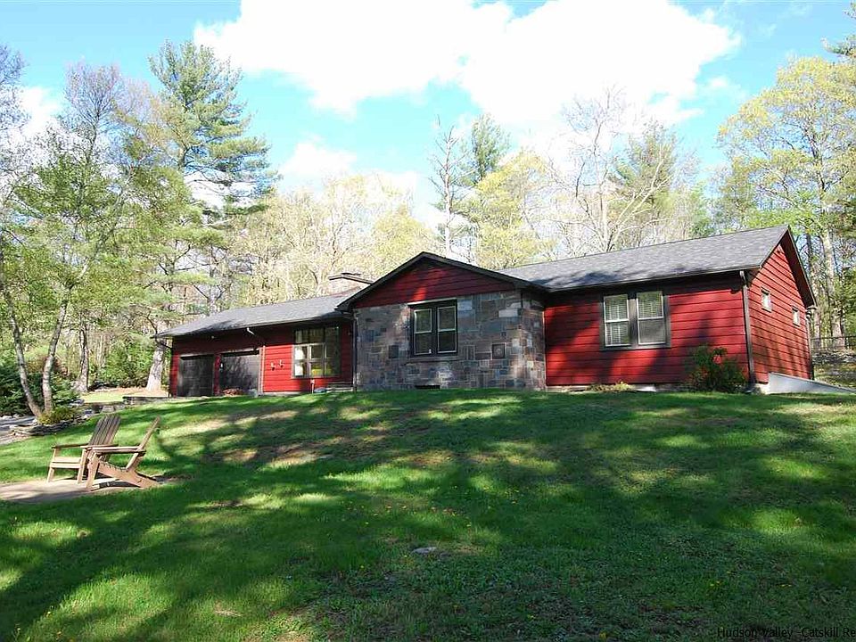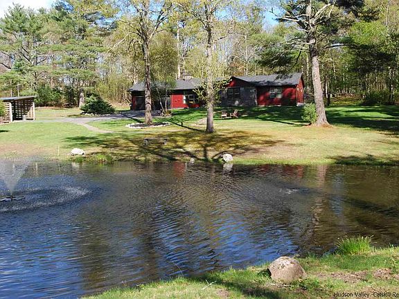 Sanctuary & solitude, an oasis all within 10 minutes of NY Thruway, 15 minutes of Woodstock Center and Village of Saugerties. One level living in a mid-century modern house located in a park-like, setting with mountain view overlooking a well-maintained aerated pond. This 5 acre parcel has wide cleared paths to wander through the woods, walk the dogs, cross country ski, all kinds of wonderful activities, and is surrounded by protected land owned by the Saugerties Reservoir. The pond is a magical sanctuary for turtles and frogs and has been well kept using all natural & organic methods. The peaceful setting of this property makes for a wonderful weekend getaway or permanent home. The house has been recently updated with a new roof, tastefully redone kitchen with all new appliances and quartz countertops, while keeping the mid-century vibe. The 3 bedrooms are all located at one end of the house, with a lovely recently renovated bath, and almost every room has a view with privacy of woods, ponds & mountain. There are two living rooms, one with a stone fireplace, and the other with a woodstove! (The second living room could be a combination of family and dining room). All hardwood flooring, and up to the minute ceramic tile in the kitchen and baths, add to the home's comfort and charm. This house has all you need with a fenced rear patio for the little guys to run around, an amply sized two car garage, custom-made sheds for storage, wood and gardening. Offers peace of mind with a security system in place. All ready to move into and start relaxing and enjoying the country life!!