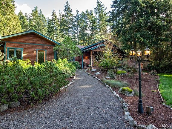 Originally called CEDAR ROCK ESTATE & renamed BELLA TERRA ESTATE. Beautifully crafted one level North West Cedar home has separate Guest house+ Craft house plus 2 detached barns & shop one w/office. Media room in main house, Gourmet kitchen, plus other bonus rooms. 30 year roof just installed August 2020. Built w/custom special features & nestled on 10.49 wonderfully wooded park-like acres enhanced by a lovely private pond, orchard & garden space with absolute privacy! A secluded island retreat.