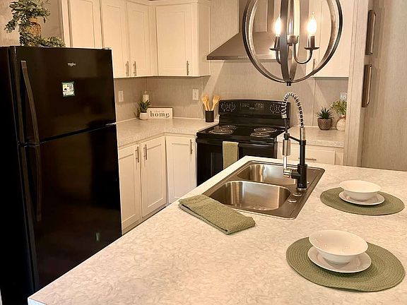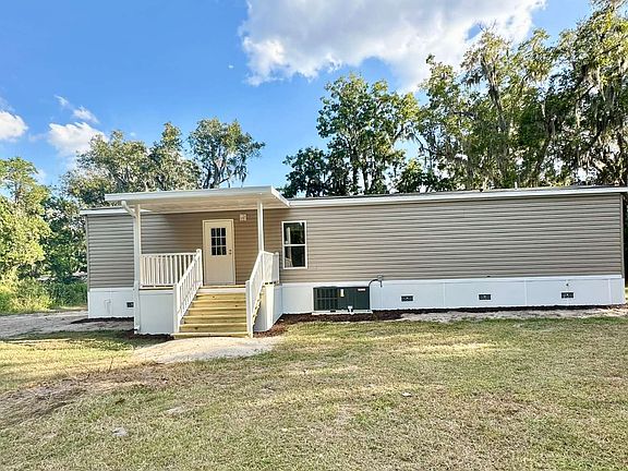 Charming, brand new two-bedroom home with two bathrooms. Each at opposite ends. The setting is beautiful among the large pecan trees on a huge lot, almost 1 ac (.90). Spacious covered front porch makes it ideal to sit and relax OR choose your covered back porch to chill outon. Brand new Goodman AC. City water but septic tank. Skirting is FHA approved, Duroc with each section having vents.