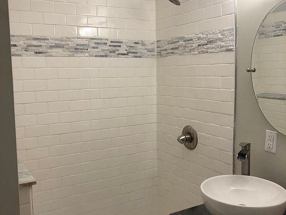 The apartment has stainless steel appliances, dishwasher, ceramic tile in kitchen and bathroom. Stand up shower, no tub.