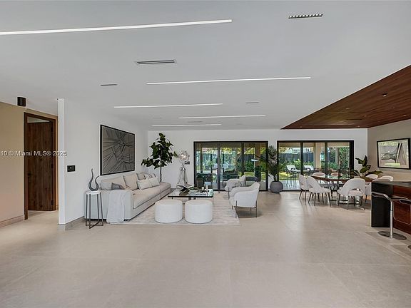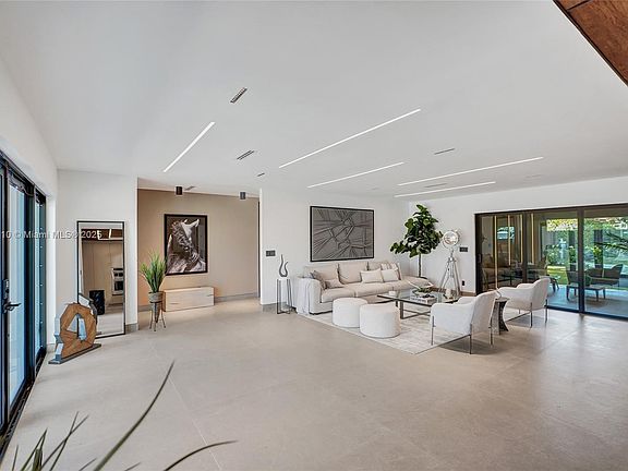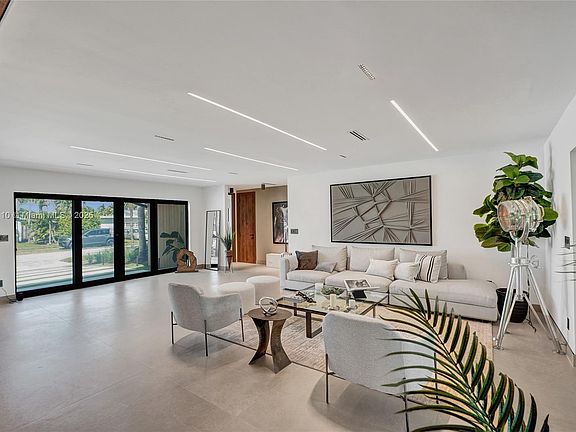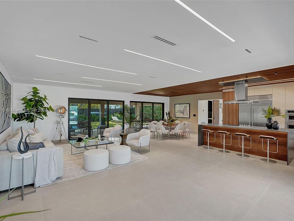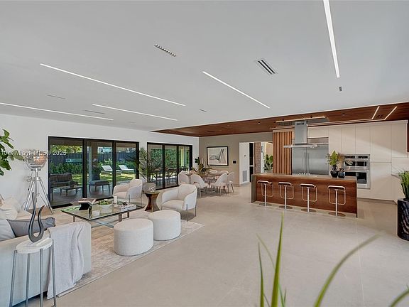 Stunning, fully remodeled modern home featuring clean architectural lines, warm natural tones, and top-quality finishes throughout. The open-concept layout highlights a sleek Italian-style kitchen with custom wood cabinetry, quartz countertops, and top-of-the-line appliances, including stainless steel appliances. This elegant residence features impact-resistant windows and doors, Italian-built-in closets, large porcelain floors, high ceilings, and designer LED lighting. The spacious living and dining areas are surrounded by glass sliders that fill the home with natural light and create a perfect indoor-outdoor flow. The outdoor space is designed for entertaining, featuring a built-in BBQ, artificial grass, and beautifully landscaped gardens. Every detail combines luxury and functionality