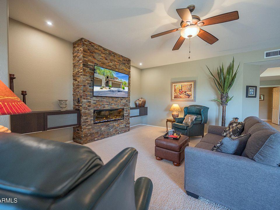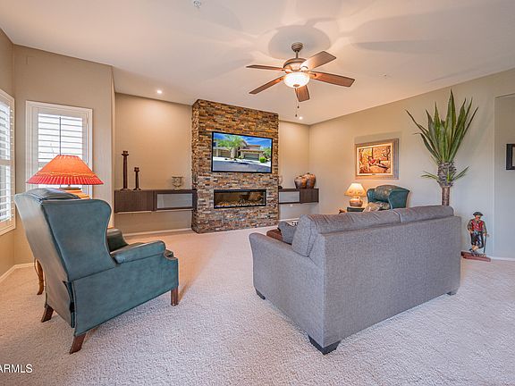 Welcome to this beautifully updated retreat in the Village at Grayhawk. Recently refreshed soft designer colors compliment the custom stacked stone fireplace wall in the living room. The Electric Linear Fireplace offers options of heat and color display. Split primary bedroom suite includes an oversized walk-in shower with 2 shower heads. Beautiful granite counters in both baths and kitchen. Plantation Shutters on all windows add elegance and privacy. This Ceilo floor plan includes a guest bedroom and versatile office/den. Interlocking durable floor tiles in the double garage with storage cabinets. Fantastic location offers easy access to shopping, golf, restaurants, hospital, community trails. The Village at Grayhawk gated community includes 3 heated pools, spas & workout facilities.