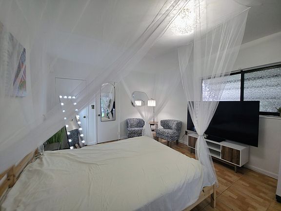 Inside: queen bed (canopy), large TV/console, dining table, lounge seating, nightstands, mirrors, rug, decor (removable). Massive walk-in closet (dresser coming), private bath, in-unit washer (no dryer). Kitchenette: fridge/freezer, microwave, coffeemaker, 2-burner cooktop. Mini-split A/C & heat (your own thermostat). 1 driveway parking space.