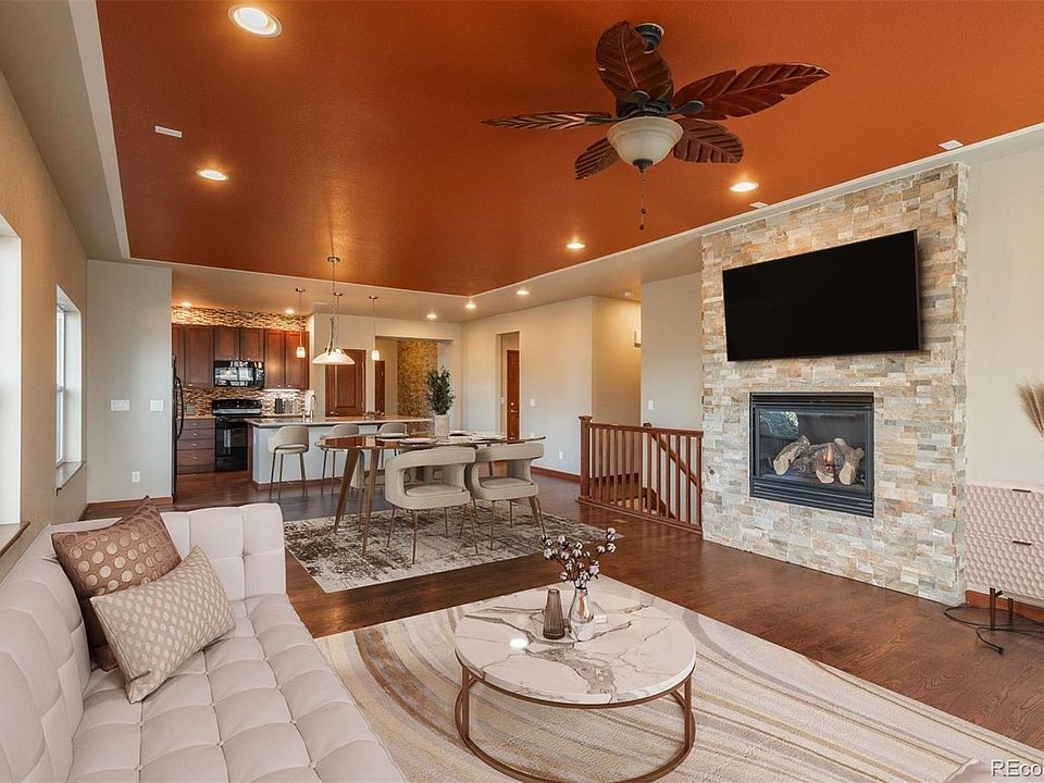 Upon entry, you’re greeted by an inviting foyer that opens to an expansive main level adorned with rich engineered hardwood floors and abundant natural light. The spacious living room features a custom stone fireplace, creating an elegant yet cozy centerpiece ideal for gatherings or quiet evenings in.
