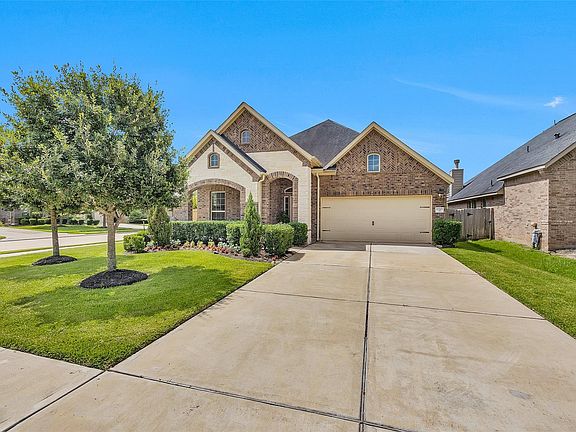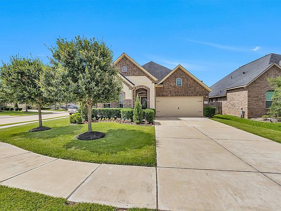 This beautifully maintained 3-bedroom, 2.5-bath home sits on a spacious corner lot in the desirable Grand Mission Estates community. With a charming brick-and-stone exterior, covered front porch, and manicured landscaping, this home offers instant curb appeal. Inside, you'll find wood flooring, soaring ceilings, and a flowing open-concept layout. The private study with French doors is perfect for working from home, while the formal dining room sets the stage for memorable meals. The chef’s kitchen features granite countertops, a large island, white cabinetry, and stainless steel appliances, opening seamlessly into the breakfast area and spacious family room. The serene primary suite includes a luxurious ensuite bath with dual vanities, a soaking tub, a walk-in shower, and a large walk-in closet. A versatile flex space separates the secondary bedrooms, ideal for a game room or media area. Enjoy outdoor living on the covered patio overlooking a fully fenced backyard.