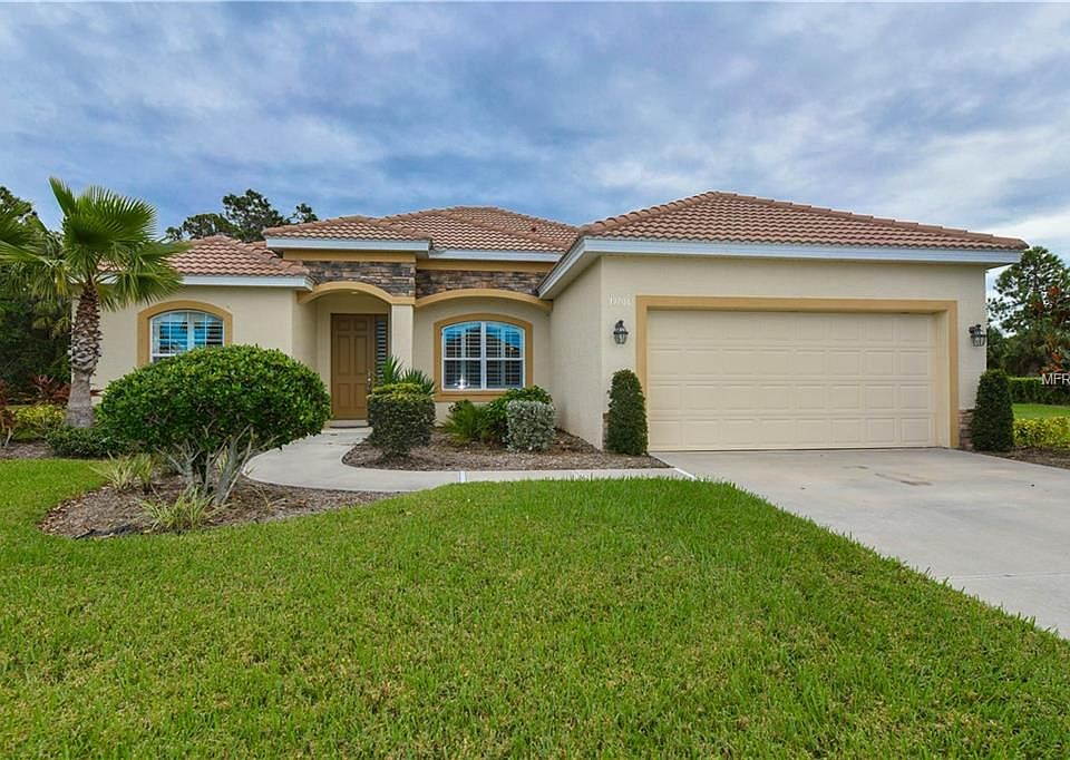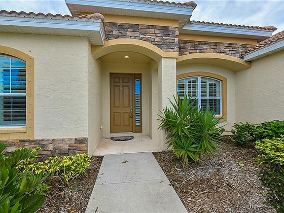 Heaven on earth describes this wonderful Florida dream home. This stunning home consists of 3 bedrooms, plus a DEN, and 2 bathrooms all just waiting for you to make your move. The perfect vacation rental for a future resident or investor. Located in a newer neighborhood called STONE WALK consisting of 73 Luxury homes on a minimum of 1/3rd acre lots. Close to I75 and shopping and the award winning beaches. The house itself has large tile throughout, designer furniture(available to purchase), a chef's kitchen with stainless steel appliances, granite counter tops, solid wood cabinets, a breakfast bar with bar stools, and a lovely dinette area. The master bedroom is split for privacy and features a large walk in closet out of your dreams. The bathrooms also have granite and wood cabinets, and one features a large Roman walk in shower. Crown molding throughout this very open floorplan with tray ceilings and every ceiling fan has its own remote, and customized Plantation shutters . The owner spared no expense. All the furniture was hand selected and very chic for an upscale look and available in a separate agreement. Located on a HUGE private wooded lot with room for a POOL. Excellent curb appeal barrel tile roof, stacked stone façade and tucked into an extra large lot where your imagination can run wild. NO CDD fees and very low HOA make this home a true WINNER. Take note FENCES are ALLOWED.