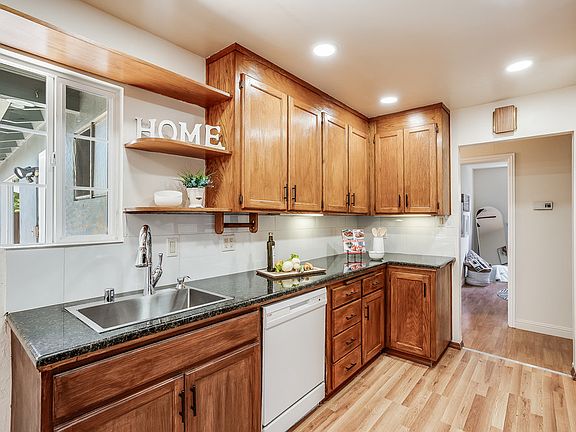 The backyard offers lots of room relax and entertain nearby mature orange and apple trees and includes a patio and bordering garden beds, newer fencing, and space for additional gardens, lawn, or play structure.