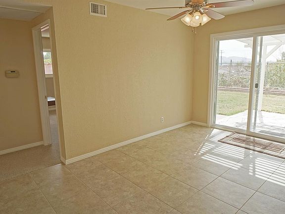 This well-cared for home boasts pride of ownership. Much sought-after single story floor plan with 3 bedrooms and 2 baths situated on a view lot. Freshly painted interior, new carpet, new tile flooring - all in lovely neutral colors. Brand new energy efficient dual-paned windows and sliding doors. Beautiful bay windows in living room and kitchen. Large living room with sliding door access to back patio. Dining area with slider opens to large stone patio with freshly painted patio cover. Pantry off the kitchen for added storage. Master bedroom has its own bathroom with shower. Ceiling fans in all bedrooms and dining area. One garage space has been converted to an enclosed hobby/work area with air conditioning unit. Great curb appeal with extra wide driveway, plenty of brickwork and large planters ready for your spring flowers. Back yard has tree top and mountain views with nice size yard and lots of planters. This home is move-in ready for you!