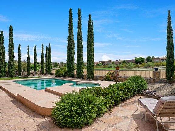 Resort style living w/heated POOL, views of the majestic Organ Mountains & the renowned Sonoma Ranch Golf course right behind this spectacular 2,738sf home. Fall in love w/this split, 4BR 3 bath home w/elegant architectural designs w/columns, plant shelves & a great room w/a wall of built-in niches & kiva fireplace. Nice 3' Plantations shutters grace every window. Entertain in the formal dining rm w/rich wood floors, the breakfast nook, the breakfast bar or extended patio w/surround sound. Kitchen boasts a built-in desk, granite composite sink, granite counters, 3dr Whirlpool(r) refrigerator, Kitchen Aid(r) dishwasher, Electrolux(r) gas cooktop, builtin mic & oven w/conv. The spacious master suite is divine w/unique accent wall that compliments the lavish wood floors. Travertine accented tiles add elegance to the ensuite w/dual vanity, large walkin closet, glass shower & jet tub. 2 of the 3 other bdms share a Jack n' Jill bathroom. Also features 3 car garage, tile roof, 2 HVAC's, 2 water heaters & water softener.