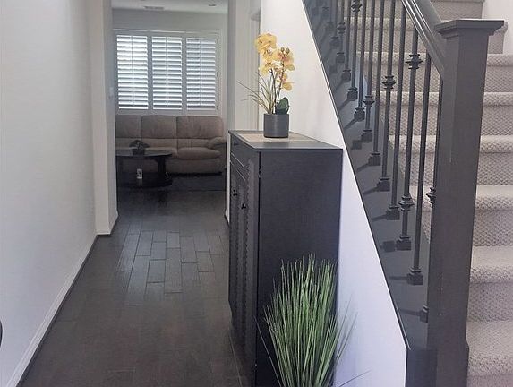 Pride of ownership beams throughout this spectacular home built in 2016 by Williams homes. Newly completed private gated community Trestles*NO MELLO ROOS*NO REAR NEIGHBORS*$$$ spent on upgrades that surely won't disappoint, window shutters, gorgeous dark hardwood flooring throughout 1st floor & upstairs hallway & master bdrm, designer neutral colored carpet on stairs & 2 bdrms, tile floors in ba rooms & laundry rm. Amazing upgraded staircase w/iron balusters & espresso colored wood hand railing enhances entry with cathedral ceiling. Open floor plan with spacious great room and beautiful gourmet styled kitchen combination boast espresso colored wood cabinetry, granite accents the counters & large center island that also features sink and bar seating, stainless steel sink and appliances. Upstairs laundry rm for your convenience, all 3 bedrooms up including a large master bedroom with enormous walk-in closet, master ba w/espresso cabinetry & double sinks, separate tub & shower, bidet seat. Entertainers backyard will wow you, embellished w/pavers & hardscape planters w/stone accents, open feel with awesome views. Amenities include recessed lighting, dimming switches, great room & bdrm wired for fans, energy efficient window and tankless water heater. 2 car attached direct access garage w/added overhead storage. Community features recreation area w/large pool & spa, park and tot area. Easy access to shopping, restaurants, biking/walking trails, nearby freeway & Metro Link Station.