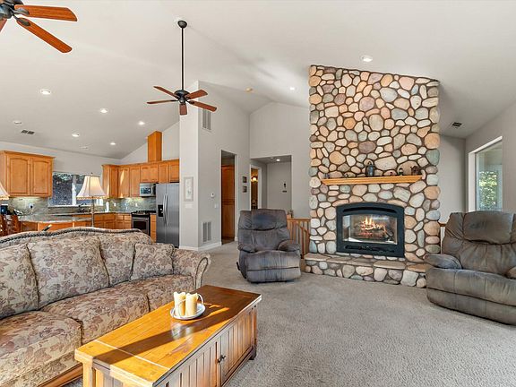 River rock gas fireplaceGranite countertopsExpansive deckVaulted ceilings