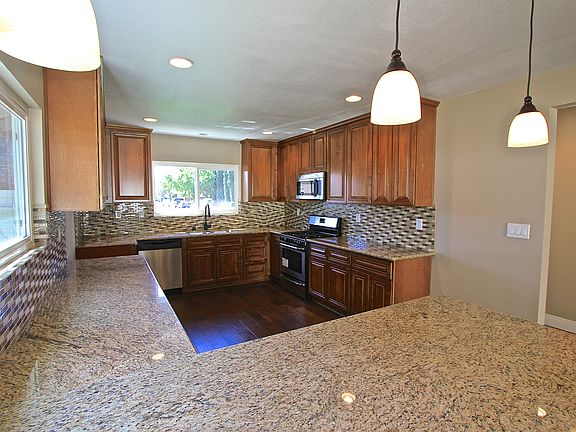 Honey, STOP THE CAR! Located on a quiet tree lined street, this beautifully remodeled home features wonderful curb appeal! Lush new landscaping, a white vinyl privacy fence & warm neutral exterior paint colors greet you as you pull into your new driveway! Inside you have almost 1800 square feet of living space, all of which has been beautifully remodeled from head to toe! Some of the upgrades include distressed engineered wood flooring, low print carpet, tall baseboard, Santa Fe Doors, recessed lighting, two tone paint colors, a stone fireplace & so much more! The light & bright open floorplan features a large Dining Room w/ new chandelier, along with a GIANT Family Room w/ a redone custom tiled stone fireplace & slider leading to the private backyard w/ covered patio area & private in ground spa! The gourmet kitchen was also remodeled from head to toe, including granite countertops, glass tile backsplash, custom cabinetry & stainless steel appliances. All 4 bedrooms boast new closet doors & ceiling fans, while both baths (including the en suite master bath) feature new vanities, granite counters & updated plumbing & electrical fixtures. Attached 2 car garage, central heat & A/C, newer roof & windows, this one truly is move in ready! ACT FAST, WON'T LAST