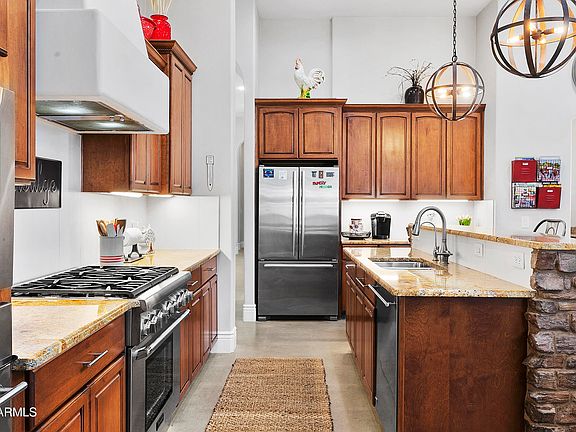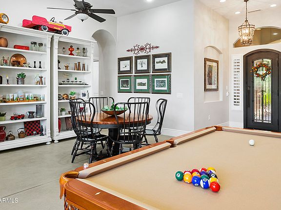 An exceptional custom home with top-tier upgrades, and an attached RV garage! Nestled on a premium lot, no neighbors behind, it backs to Queen Creek Wash's scenic 11-mile trail—perfect for walking, cycling, and horseback riding. The chef's kitchen stuns with a Thermador gas range, wall ovens, butler's pantry, and an island open to the family room. High ceilings, upgraded doors and trim. Outdoors, enjoy the outdoor kitchen and a stunning heated pool (2021). The 3-car garage is oversized (24' deep) plus attached spray-foam insulated RV garage (2020) and an RV gate for all your toys! This subdivision of larger lots enjoys tree-lined streets, all single-level homes and allows RV parking. Don't wait to view this stunning home! The RV garage is 20 x 42' and has a bathroom with storage above. The front door is 15'x15' and the rear door is 8'x8'. Can accommodate a motorhome/RV up to 40'. There are also sewer clean outs that could be used for an RV adjacent. If desired, it would be easy to partition off part of the RV garage into a Casita as the bathroom is already in place.