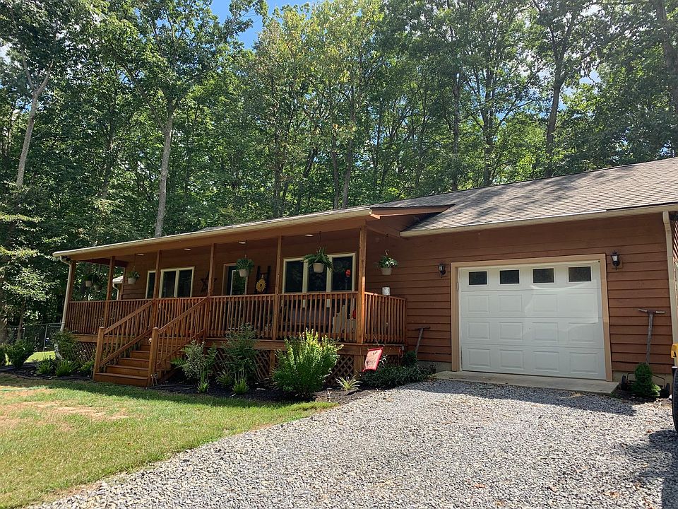 Henson Heaven. Enjoy a newly built (2014) open floor plan one level home that includes a large master suite, plenty of decks, and lots of privacy and a private drive. House features 2 heat/AC pumps plus a back up propane furnace. Nice free standing propane fireplace, screened porch, covered decks, large windows, propane gas stove, and appliances conveying. 384 sq ft. Garage and outbuilding. Well, septic. Property consists of approximately 4.57 acres with 3.5 acres walkable woods; 1.5 acre cleared. Nice walking path on property. Excellent parking. See awesome Virtual tour under photo tab.
