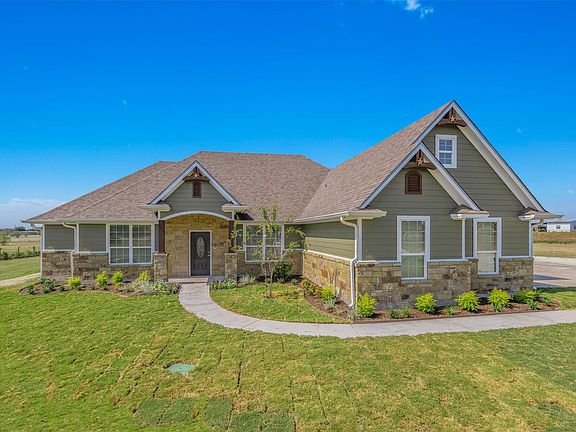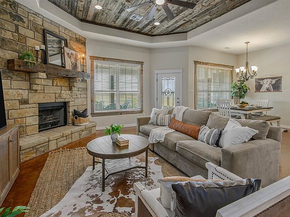 Nestled on an expansive 3-acre lot, this rustic-style home offers comfort and charm in a peaceful setting. Step inside to a welcoming living room with a warm fireplace, rustic wood ceiling, and windows framing views of the back property. The kitchen features a walk-in pantry, butcher block island, and spacious eating bar, flowing into a dining room overlooking the patio. A dedicated office and second living area provide versatile space for work or relaxation. The primary suite is a serene retreat with large windows, dual oversized walk-in closets, and a spa-like bath with a double shower. Downstairs, two bedrooms share a Jack-and-Jill bath with private closets, while upstairs a private guest suite with en-suite bath offers comfort and privacy. A well-designed laundry room with counter space and storage adds convenience. This 4-bedroom, 4-bath home balances rustic character with modern function in a tranquil acreage setting.