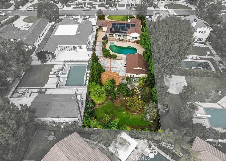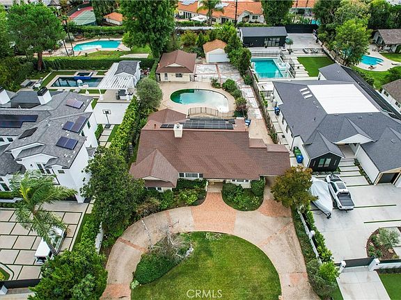 The main residence includes three generous bedrooms and three bathrooms, while a separate guest house—complete with its own private bath—sits toward the rear of the property, ideal for visitors, extended family, or creative use. Passing through the porte-cochere and down the private drive, you’ll find a spacious motor court and a two-car garage with extensive additional storage. Outdoors, enjoy sun-filled grounds surrounded by mature landscaping, an expansive entertainer’s patio, sparkling pool and serene setting with endless possibilities on its untouched spaces. Whether you’re an end-user, contractor, or developer, this is a rare chance to acquire a highly versatile property in one of Woodland Hills’ most sought-after pockets. With multiple structures, abundant space, and an unbeatable south-of-the-Boulevard location, the potential here is truly extraordinary.