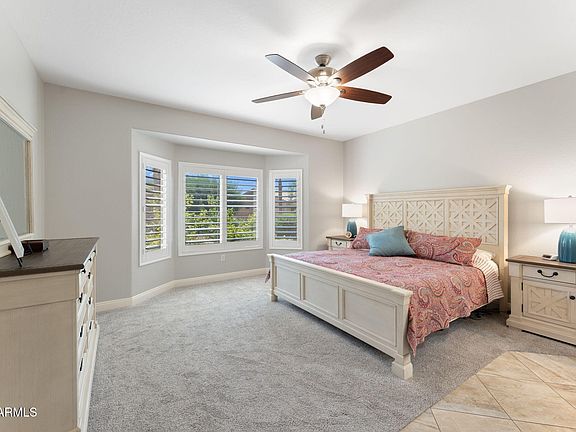 Charming1870 sq ft Palo Verde Model with split bedrooms and 2 baths. New carpet in bedrooms, new tile in living area, new paint and plantation shutters throughout the interior of the home and new washer and dryer. Remodeled Kitchen (quartz counters and backsplash, fan, stove top, microwave, built-in oven, sink and faucet), Bathrooms (flooring, toilets, vanities with quartz counters, shower in master, hardware including grab bars) Extended garage with plenty of built in storage includes separate accessibility to golf cart parking. East facing private back yard with water feature, built in gas BBQ including motion light and tv outlet, electrical outlets and fans in extended covered patio. Irrigation system has been replaced with PVC piping. All the amenities of The Grand are included