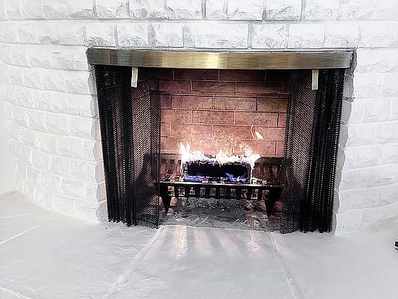 The main section of the houses is a living space encompassing a space large for a dining table and chairs, and a living room with a wood-burning fireplace which can be easily converted to gas. Purchase includes TV with oak stand, dining table and chairs.