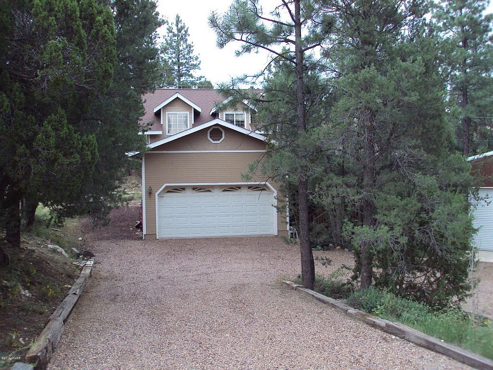 Nestled in a beautiful setting surrounded by tall pines, this home is perfect for year round living or summer home. Main floor has an open floor plan w/kitchen and great room w/gas fireplace, master bdrm, laundry and 2 (3/4) baths. Upstairs bedroom/loft is HUGE w/a 1/2 bath and could easily be made into 2 bdrms. Bottom level offers a family room and 3/4 bath. There is an attached garage w/a large workshop as well as a detached oversized 32'x40' garage for the car collector. Outdoor deck wraps 3/4 around the house w/a built in bbq. Great home for a family and collector of cars and toys.
