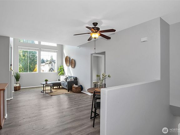 Centrally located and directly across from Powderworks Park, this stylish 2-bed, 2-bath home offers modern comfort and convenience. Enjoy fresh interior paint, updated LVP flooring, and a vaulted ceiling that adds an open, airy feel. The cozy living room features a gas fireplace, while the kitchen and dining area flow seamlessly for everyday living. The primary suite includes a walk-in closet and private bath with oversized tub/shower. Relax on the covered patio with extra storage, plus benefit from an attached garage for easy access. Exterior and landscaping are maintained by the HOA, allowing for low maintenance living. Just minutes to miles of trails, parks, I-5, and JBLM. Welcome Home!