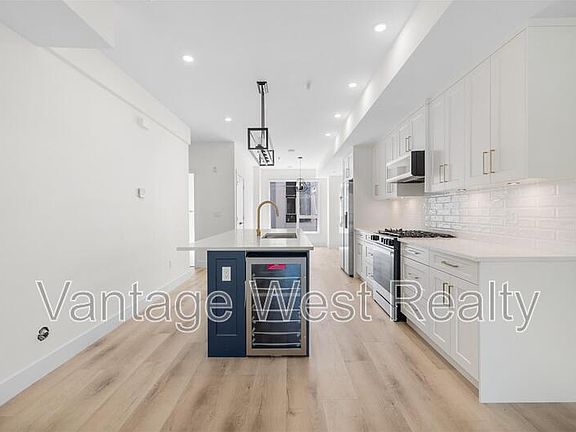 Wine fridgeGas rangeMatte gold fixturesStainless steel appliances