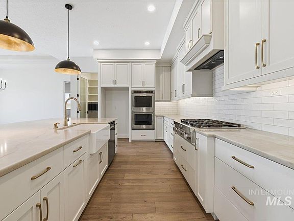 Beautifully designed single-level home in North Meridian, featuring a spacious garage and RV bay. The open-concept layout includes high-quality finishes throughout, a generous kitchen, a great room, and a dedicated dining area. This home offers a luxurious primary suite and a private en-suite with separated bedrooms, ensuring comfort and privacy for guests. The kitchen is thoughtfully equipped with built-in double ovens, a large island, and ample cabinet space. The primary suite boasts tall ceilings, abundant natural light, and a spa-like bathroom with dual vanities, a stunning walk-in tile shower, a freestanding soaking tub, and an expansive walk-in closet. Additional features include 8" tall doors throughout, large sliding glass doors leading to a covered patio, and a tankless water heater providing on-demand hot water.