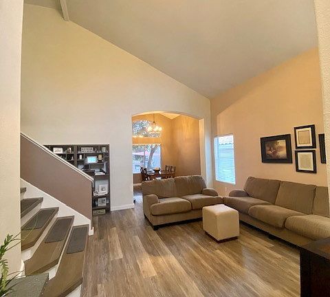 Located in the center of Green Valley Ranch with an IN-GROUND POOL! This beautiful home has a neutral color palette, vaulted ceiling/spacious front living room entry, beautiful lux vinyl plank waterproof flooring throughout first floor, custom butcher block counter/custom sliding barnwood pantry door & GORGEOUS quartz kitchen countertops with cozy dine-in eating area, separate dining room, family room off kitchen with large TV nook and overlooks backyard pool area, downstairs 1/2 bathroom, extra storage room under stairs, laundry room with access to garage which has cabinets and shelving unit that stay with property. Upstairs primary bedroom overlooks backyard with spacious bathroom, 2 sinks, separate bathtub and shower, walk-in closet. Full bathroom upstairs next to the 2 other bedrooms. This home is truly the pride of ownership. Parks/recreation areas/shops/schools nearby. Outdoor trail at the end of the street.1 yr. Home Warranty included!