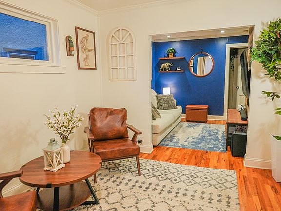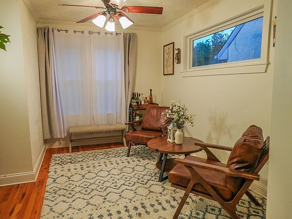 Updated bungalow with a covered front porch nestled in a quiet neighborhood. The kitchen features granite countertops, stainless steel appliances, and a breakfast bar. The main floor offers a flexible layout with beautiful flooring, oversized white trim, recessed lighting, and crown molding throughout. Upstairs, brand new carpet was installed in 2022. Additional updates include a new garage opener (2022), blacktop driveway (2023), 6-foot privacy fence (2023), new gutters (2025), and professionally cleaned air ducts (2025). Low-maintenance siding and windows along with an oversized one-car garage and a backyard with patio space.