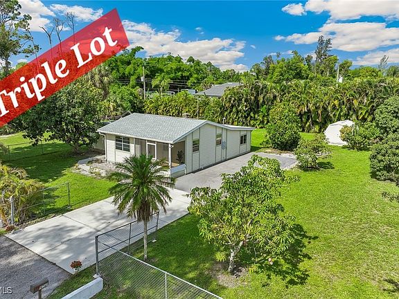 MAJOR PRICE REDUCTION!! LOOKING FOR MORE OUTDOOR SPACE IN THE ESTERO/SOUTH FORT MYERS AREA? Oversized piece of property is .67 acre with 210' of frontage! This very unique property is situated on THREE LOTS with room to expand on either side of the home. Plenty of room for expansion, a rebuild and/or renovation!! New Roof in 2022! Three sheds (2 wood, 1 metal) with floors and shelving on the northern-most lot! Extra long driveway ideal for Recreational vehicles, boats, multiple cars/trucks. To enter the home, you will enter through the 12' x 6' screened-in front porch with wooden decking! This charming home features an open floorplan with the dining and living areas only separated by a small area perfect for a desk or hutch. The two bedrooms feature ceramic tile, newer ceiling fans, mini-blinds and views of the backyard! Primary bedroom is closest to back deck with slider door access, private bathroom with walk-in shower. Galley kitchen with white cabinets and appliances! Covered Wooden Deck out the back door with sun shades, stainless counter & sink. Utility room (10' x 13') houses the washer & dryer and offers even more storage! Chain Link Fence around the perimeter of 2 of the 3 lots with large Double Gate at Entrance. Well 350' deep! Water Softener for the house! Septic system! Delectable, juicy mango and jack fruit trees abound! INCREDIBLE LOCATION - CLOSE TO AIRPORT, HERTZ ARENA, COCONUT POINT MALL, MIROMAR OUTLETS AND FGCU! No HOA, No Pet Restrictions!
