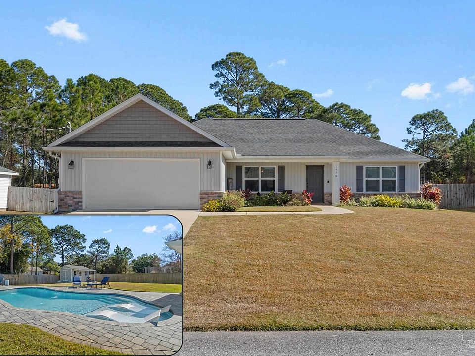 Discover the ultimate Florida retreat - an impeccably maintained POOL home built in 2020, offering quality craftsmanship & timeless finishes. This 3-bedroom, 2-bath home is truly move-in ready & sits on a spacious 0.33-acre lot with no HOA restrictions. Step inside to soaring cathedral ceilings, abundant natural light, & a seamless open-concept design. Durable luxury vinyl plank flooring extends throughout the entire home - no carpet in sight - providing effortless upkeep & a clean, contemporary feel. Fresh interior paint, elegant granite countertops, & oil-rubbed bronze fixtures add refined touches. The spacious kitchen overlooks the living & dining areas, making it ideal for entertaining or enjoying relaxed evenings at home. It features stainless steel appliances, abundant cabinetry, & a large pantry for ample storage. The split floor plan keeps the primary suite separate from the other bedrooms, making it a private & peaceful place to relax. The en-suite bathroom includes a double vanity, a spa-inspired walk-in shower with dual shower heads & a sleek barn-door style glass enclosure, along with exceptional storage: a generous walk-in closet, an additional reach-in closet, & a dedicated linen closet. The true highlight is your private backyard oasis. Unwind or host gatherings on the covered patio overlooking the sparkling gunite pool, beautifully surrounded by pavers. The fully fenced backyard also includes a large shed, perfect for tools, hobbies, or extra storage. From sunny poolside afternoons to evening barbecues under the stars, this outdoor space captures the essence of coastal living. Ideally located near pristine beaches, top-rated schools, & everyday conveniences, this home offers the perfect blend of comfort, location, & lifestyle. Don't miss the opportunity to make this Florida paradise your own.
