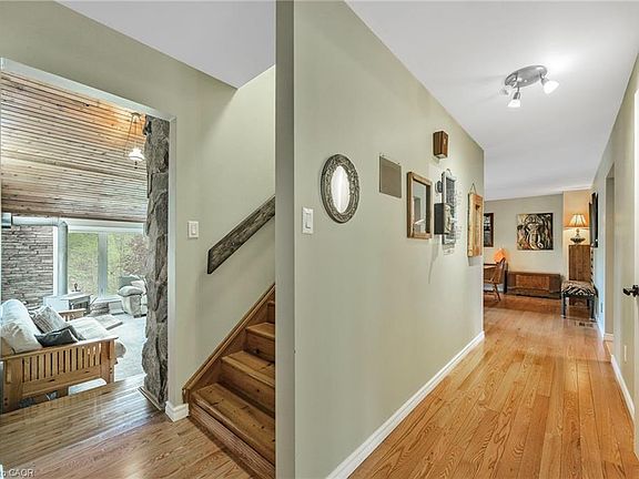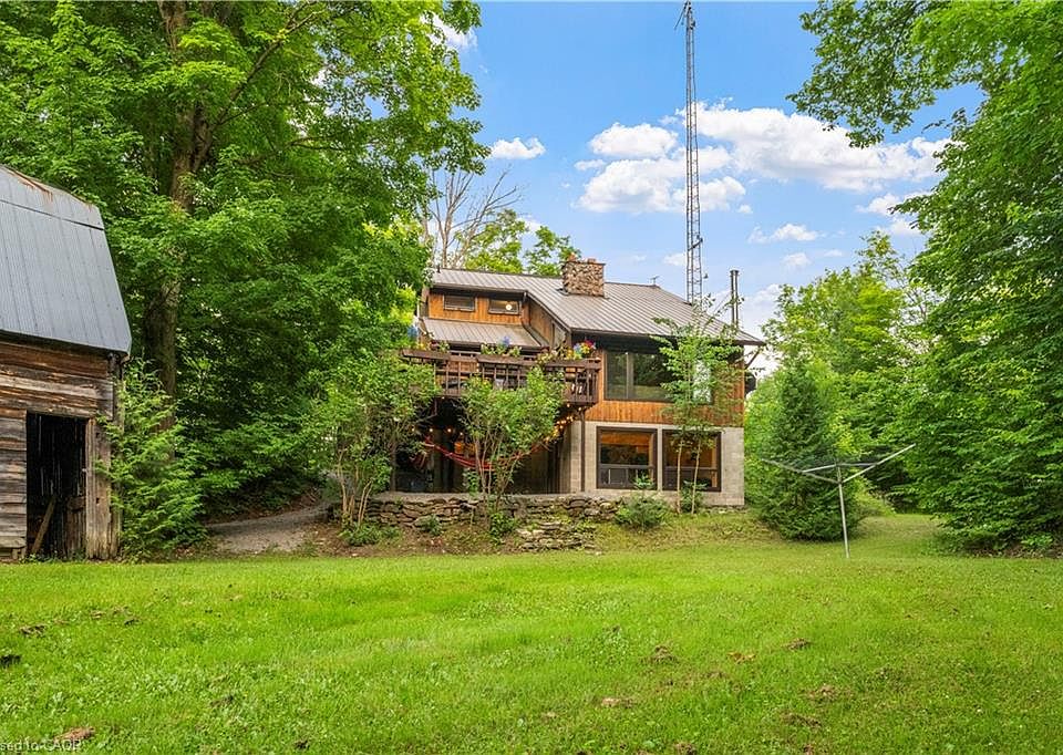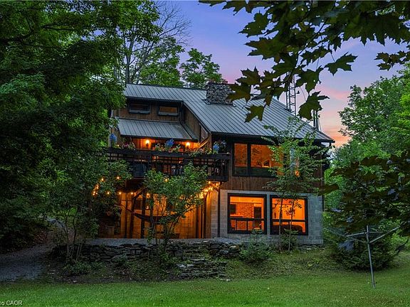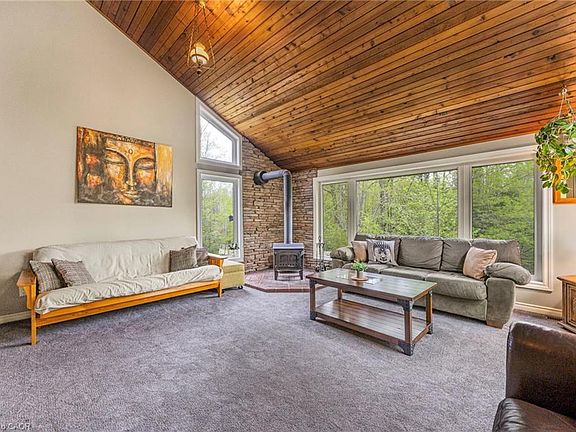 Chalet vibes, vaulted ceilings, and cottage charm welcome to your 3+3 bed, 3 bath escape in Kawartha Lakes. Set on 10.12 acres with 300 ft frontage, this Viceroy-style home brings the outdoors in with wall-to-wall windows, wood finishes, and multiple walkouts to a wraparound sundeck. The great room stuns with a stone fireplace, soaring ceilings, and forest views. Enjoy an eat-in kitchen with bamboo floors, vaulted pine ceilings in the dining room, and a sunroom hot tub moment allowing for a deep exhale. Upstairs: a primary suite with his/hers closets and ensuite. Downstairs: two bedrooms, a walkout rec room, fireplace, and spiral staircase. Massive 32x40 ft updated heated studio workshop (2022) with in-floor heating, 200 amp service, and room for six+ vehicles. Updated windows/doors (2022), new eaves (2024), and furnace (2023). Just 4 mins to Balsam Lake Provincial Park, this is a full-time home or dreamy weekend retreat. Nature, privacy, and pure peace all wrapped into one.