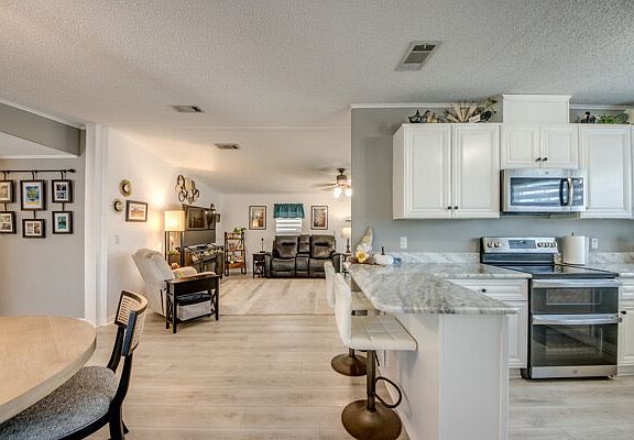 If you're looking for a beautiful, move-in-ready home - this is the one! This spacious 2-bedroom, 2-bathroom home is located in the desirable gated golf community of Pine Lakes Country Club. Inside, you'll find new flooring throughout, an updated kitchen with gorgeous countertops and modern cabinetry, and renovated bathrooms with stylish finishes. The home features high ceilings and new windows and custom window treatments filling every room with natural light. Enjoy the outdoors on the large patio area, perfect for relaxing or entertaining guests. Additional features include an inside laundry area, a full 2-car garage, and a large lot offering plenty of space and privacy. Pine Lakes offers resort-style living with a wide range of amenities - including a beautiful clubhouse, heated pool and jacuzzi, tennis, pickleball, bocce ball, and a busy social calendar full of events and activities. You'll also love the convenience of the on-site restaurant and pub. This home is located on a leased lot with a monthly lot fee of $1,248. A detailed list of all updates is available upon request. Contact DeeAnn for your personal showing! Out-of-town buyers are welcome - FaceTime showings available.