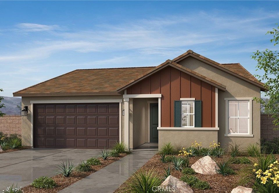 This beautiful and efficient 1548 sq/ft single-story floor plan is in the popular Orange Crest neighborhood of Riverside. All Argento @ Citrine homes are single-story and offer soaring 9-ft ceilings and large windows to let in lots of natural light. This home is enhanced with a south-facing location on a cul-de-sac street and is steps from one of the community parks. This floor plan boasts a large kitchen/great room combo that gives you plenty of room for entertainment and family fun. This home also includes luxury vinyl plank flooring in most areas and is complemented by the use of soft low-pile carpet in bedrooms and closets. The stylish kitchen features an island, an abundance of Shaker-style cabinets, quartz countertops, and Whirlpool® stainless steel appliance set: electric range, microwave, and dishwasher, undermounted kitchen sink with Moen faucet, and large walk-in pantry. The great room opens to a nice sized back yard perfect for family gathering and outdoor activities. There are 3 bedrooms, two of which offer walk-in closets, and there are 2 full bathrooms. The primary bathroom offers large shower, linen closet, dual sink vanity, in addition to the large walk-in closet. This home sits on an estimated 5,100 sq/ft lot with driveway and two-car garage. The two community parks offer outdoor family fun with playground equipment, dog parks, and open spaces! Great schools are nearby as well! Photo is a rendering of the model. Buyer can either lease or purchase the Solar.