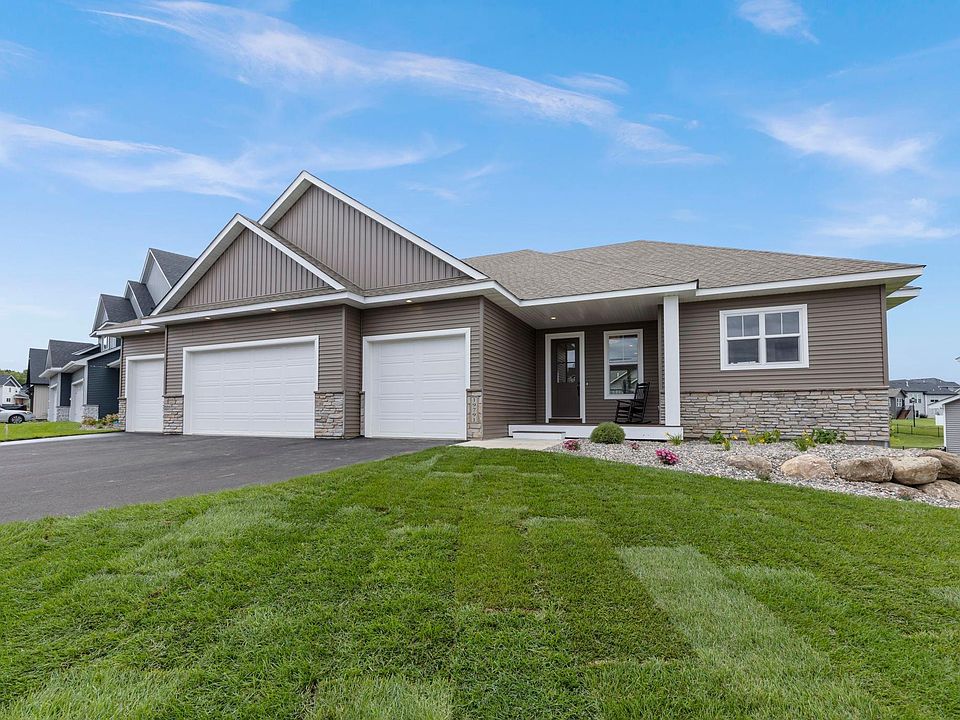 Welcome to the Magnolia III, an exquisite custom-built rambler by Stone Cottage Construction in the Berres Ridge community of Lakeville. This thoughtfully designed home offers 5 bedrooms, 3 baths, and a finished walkout basement, combining luxury and functionality. The open-concept main floor features 10-ft ceilings, engineered hardwood floors, and a stunning kitchen with a large center island, soft-close cabinetry, quartz countertops, gas range with hood vent, and wall oven. The adjacent dining area flows into a spacious great room with an electric fireplace — perfect for entertaining. The main-floor primary suite is a private retreat with a spa-like ensuite bath, dual quartz vanity, tiled walk-in shower, private toilet room, and direct access to a walk-in closet and laundry room. A second main-level bedroom offers flexibility as a guest room or home office, serviced by a full bath. The finished lower level includes a large family room, 3 additional bedrooms, a full bath, and access to the backyard. Enjoy outdoor living on the front porch with TimberTech maintenance free decking, beautiful landscaping with irrigation, and a spacious 4-car garage. A truly exceptional home with high-end finishes throughout! Stone Cottage is a custom builder with various options. Model Hours: Fridays 3-6pm, Saturday & Sunday 11-4pm.