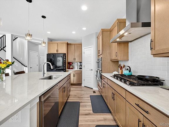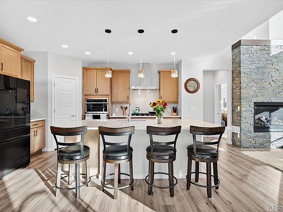 Step inside to an open floorplan featuring a gorgeous chef’s kitchen complete with a gas cooktop, double ovens, quartz countertops, and an island with counter seating. The living room offers vaulted ceilings and a stunning stone gas fireplace, creating a warm and inviting space for relaxing or entertaining. Enjoy modern lighting throughout. The living room and foyer lights can be managed by an app on your phone.