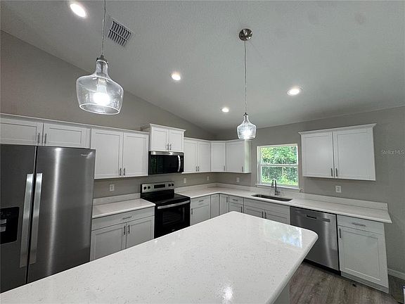 One or more photo(s) has been virtually staged. MOVE IN READY!! Beautiful new construction home in Rainbow Springs Country Club! Luxury Plank Vinyl flooring throughout all living and common areas, tile in bathrooms, and carpet in the bedrooms. Open floor plan with dining room and large kitchen island area, all done in neutral, pleasing colors. Inside laundry with W & D hook-ups. Walk-in closet + regular size closet in Master bedroom. Stainless steel appliance package in the kitchen. Cabinets are white shaker-style with light luxury quartz countertops. Please see attached documents from Builder (Builders Contract Addendum & Warranty) Actual photos are attached plus virtually staged model home photos for reference. Any photos depicted are for illustration purposes only and only to show layout. Floor plan displayed is our standard plan and garage orientation may vary on actual home. Interior and exterior colors, finishes, and garage orientation will vary for actual home. Information is deemed correct, but no guarantee made. Any dimensions listed are approximate. ***Inquire about our preferred lender deals! Builder offering to contribute to buyer’s closing costs or help with rate buy downs! We can be flexible to help our buyers get into a beautiful home! ***