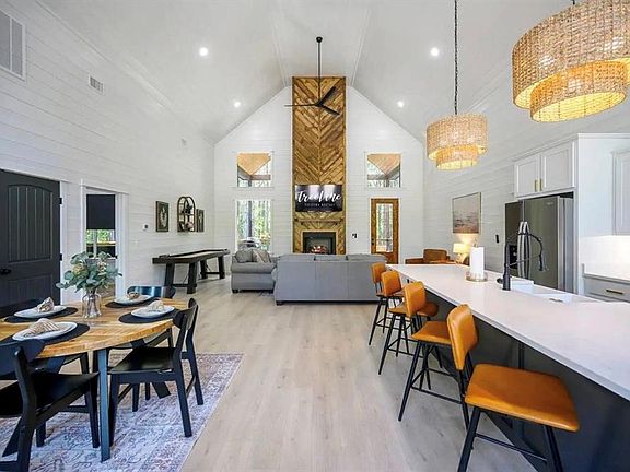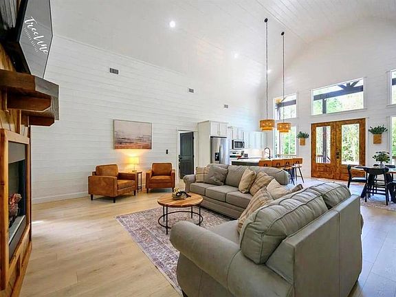 The open-concept living area is designed for relaxation and socializing, with a grand stone fireplace that serves as the focal point. The rich wood finishes and high vaulted ceilings create an inviting and cozy atmosphere. Comfortable seating areas surround the fireplace, perfect for winding down or enjoying a conversation.