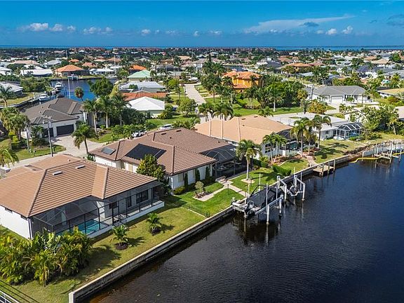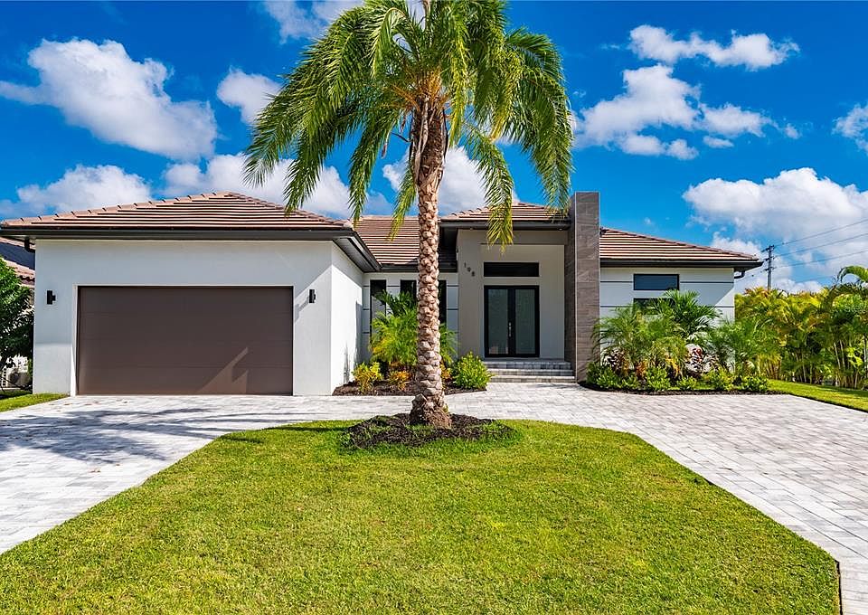 Why wait to build? Step inside this move-in ready, sailboat waterfront, masterpiece that captures the essence of modern luxury and coastal sophistication. Every detail has been curated with precision, from the clean architectural lines to the subtle textures that invite light and warmth into every corner. As you enter, natural light floods through a blend of contemporary and transom windows, filling the home with a bright, inviting glow. Driftwood-style porcelain plank flooring flows seamlessly throughout, while tray ceilings rise to twelve feet, creating an airy and refined atmosphere that defines the open living space. At the heart of the home, the kitchen stands as a true centerpiece. Rich chocolate shaker cabinetry pairs beautifully with gleaming quartz countertops, their veining highlighted by European-style brass-toned hardware. Stainless steel appliances complete the space, while the impressive 3.5 by 10.5 foot center island offers the perfect gathering place for casual dining, entertaining guests, or showcasing culinary creations. The great room is designed for both comfort and style, featuring a slate-tiled accent wall with a sleek fireplace that adds a polished ambiance. Triple sliding glass doors open wide to the lanai and heated pool beyond, creating a seamless connection between indoor and outdoor living. The open dining area enhances the flow of the home and provides an elegant setting for evening meals as the sunset casts a warm glow through the windows. The primary suite offers a private retreat with a tray ceiling, spacious walk-in closets, and sliding glass doors that lead directly to the lanai and pool. The ensuite bath feels like a spa, with a garden tub, a walk-around shower featuring a rain head, and stone-style shower flooring that contrasts beautifully with luxurious 36 inch marble tile. Each additional bedroom provides a peaceful atmosphere, ideal for family members, guests, or a home office without compromising comfort or space. The covered lanai is plumbed for a future summer kitchen, making it the perfect place to entertain poolside while enjoying stunning sunsets. An outdoor shower, epoxy-finished two-car garage, hurricane-rated impact windows and doors, circular driveway, and lush landscaping add to the home’s thoughtful details. Located on sailboat water just minutes from the open expanse of Charlotte Harbor and the Gulf Islands beyond, this home blends modern design with coastal elegance. Enjoy the convenience of being within close distance to Fishermen’s Village with its waterfront shops and restaurants, nearby parks, scenic trails, and Punta Gorda’s charming historic downtown filled with year-round events and markets. This home represents the perfect fusion of comfort, craftsmanship, and coastal beauty, offering an exquisite place to live, relax, and entertain.