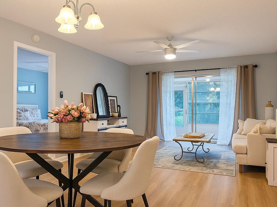 Welcome to this fully updated first-floor 1BR/2BA condo, perfectly situated in one of the best locations in Golden Lakes. Enjoy a tranquil water view from every room. This private corner unit has no homes across from it - just relax on your private patio and watch the birds.This move-in ready condo features a spacious bedroom with a large walk-in closet, an expanded brand-new kitchen with soft-close cabinets, new appliances, new washer & dryer. The home is enhanced with new luxury waterproof vinyl flooring throughout, recessed lighting, and new fans in every room. Both bathrooms have been tastefully renovated. Can be sold furnished or unfurnished. Comes with an extra storage room just walking distance. Additional updates include A/C (2018) and a new water heater. The low HOA fee covers cable & internet, water, building insurance, lawn care, pest control, a 24-hour guard gate, several pools, performance center, billiards, courtesy bus service, and much more.