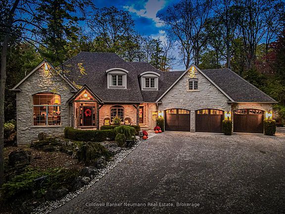 Set against the limestone escarpment on a private 1.1-acre lot at the end of a quiet road in Rockwood, this extraordinary retreat is surrounded by conservation land, offering complete privacy and a deep connection to nature. What began as untouched forest became an architectural masterpiece - the result of over three years of meticulous planning, permitting, and passion. Eighteen feet of rock were carved away to shape the foundation. A centuries-old log cabin from Ariss was carefully deconstructed and reassembled on-site, bridging history with modern innovation. Even the entrance was designed to impress - complete with its own handcrafted bridge leading to the home's grand arrival. Inside, the craftsmanship speaks for itself. Soaring cathedral ceilings, oversized windows, and panoramic forest views create an atmosphere that's both inspiring and serene. The main living area opens onto a European-style stone courtyard, while the primary suite feels like a private spa, complete with a luxurious ensuite and its own tranquil waterfall outlook. Upstairs, two additional bedrooms and a full bath offer comfort and flexibility for family or guests. The walk-out basement opens to a stunning flagstone patio complete with a hot tub - an ideal spot to unwind in total tranquility. Inside, enjoy the well-appointed entertainment level featuring a custom bar and private wine cellar, a pool table area perfect for friendly competition, a theatre room to catch the big game, a dedicated gym space for workouts, a full bathroom, and more. And then there's the historic 550 sq. ft. log cabin - beautifully restored and ready to serve as a guest house, creative studio, or personal sanctuary. Outfitted with a wet bar, gas fireplace, full bathroom, and ample storage, it's a destination all its own. A triple-car garage with lift provides ample room for vehicles, hobbies, and adventure gear, blending practicality with luxury. Schedule a private showing today to experience 198 Pasmore.