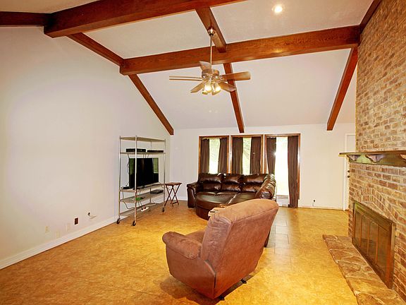 Plenty of room for the entire family AND the horses! You'll love the privacy and seclusion this home offers, with 5 acres of trees all over, but still close to town. Located just behind the high school, this 4/2 features big rooms throughout. Walk into a dramatic living room w/ vaulted ceilings and a huge, brick fireplace. The kitchen is spacious, w/ great cabinet and counter space. The master bed and bath are large, with dual vanities and closets. Fresh paint throughout, nice tile and laminate floors. Separate septic, electricity and water hook ups for an RV in the back of the property.