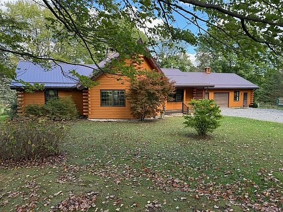 Amazing Log Home with elevator on 2.86 beautiful acres in Mercer County! Cathedral, vaulted ceiling, a gorgeous two-sided cut-stone fireplace and open concept contribute to the WOW factor! 2 level private deck, loft above kitchen and dining room, newer metal roof, storage shed, playhouse, full basement, bonus room off garage, and greenhouse are just some of the amenities. Gazebo in the fabulous yard!! Home recently painted (2022).