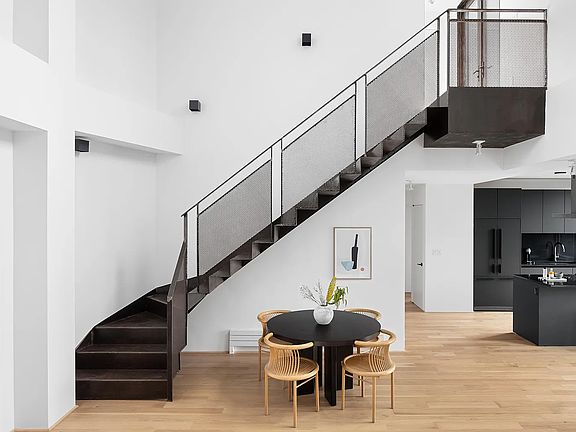 Inside, 16-foot-tall ceilings soar over wide-plank white oak floors and oversized windows, while bespoke ironwork, polished concrete and trimless art walls create a modern take on the desirable industrial aesthetic. An open living/dining area opens to a sleek kitchen finished with dark custom cabinetry countertops and integrated appliances, including a vented gas range, French door refrigerator, dishwasher and microwave drawer.