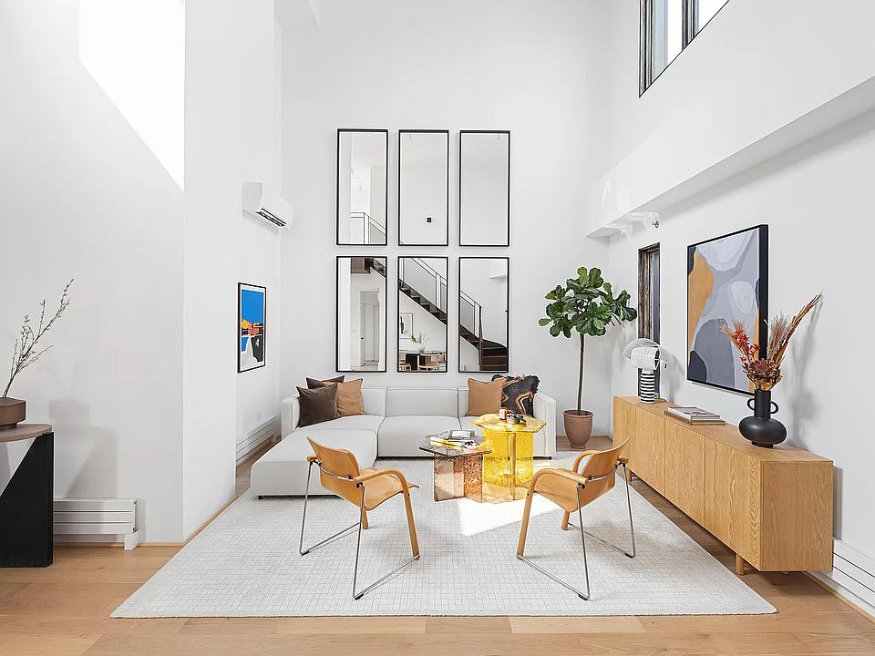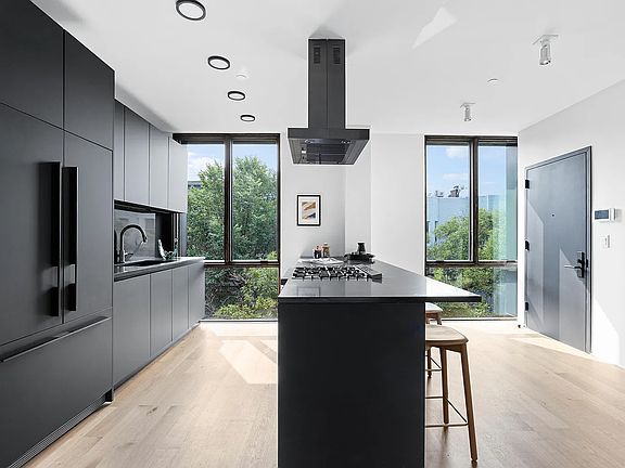 In the main-level secondary suite, custom reeded glass and steel doors open to a work-of-art en suite bathroom with a soothing shower surrounded by bespoke hardware, polished concrete and glass. The second bedroom on this level boasts an adjacent equally well-appointed full bathroom, while a dramatic custom steel staircase leads to your magnificent upper-level sanctuary. Here, you'll find a full-floor primary suite with a large storage room, walk-in closet and a magazine-worthy, skylit bathroom with a freestanding soaking tub and exquisite rain shower. Enjoy seamless indoor-outdoor living with a huge private roof deck featuring breathtaking views and a custom outdoor kitchen finished with a grill, refrigerator and sink. Ductless air conditioners and modern low-profile radiators ensure year-round comfort, while custom closets and an in-unit washer-dryer add convenience to this distinctive new Brooklyn home.