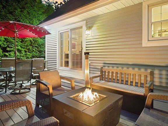 Double-sided fireplaceOversized composite deckStone wallsOpen-concept layoutRemodeled kitchenBreakfast barVibrant perennial gardens