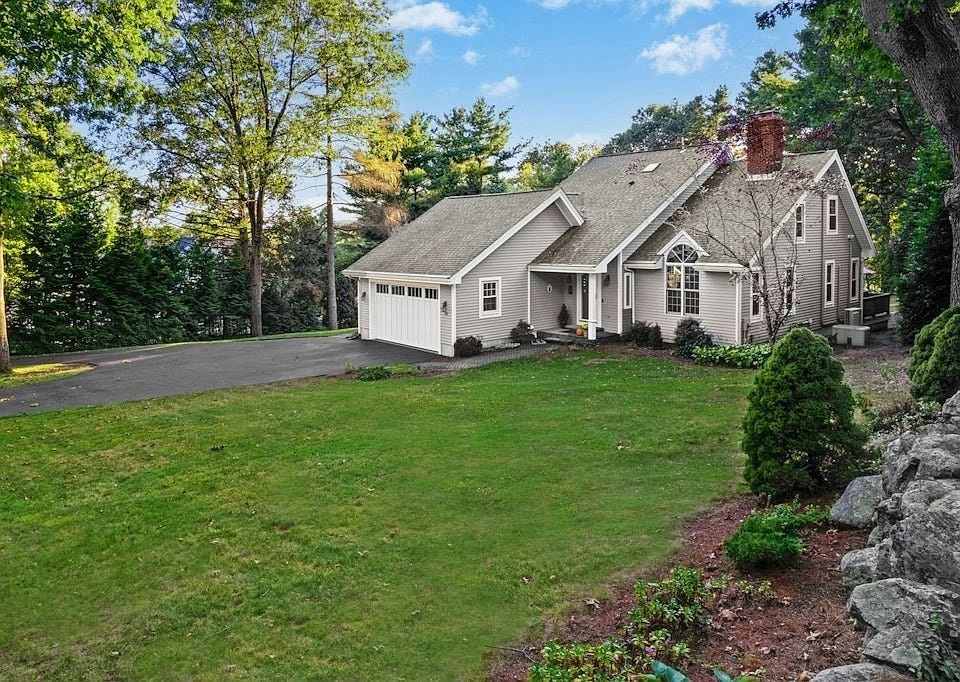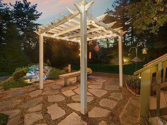 Nestled on a picturesque wooded lot, this custom-built contemporary Cape offers the perfect mix of comfort, style, and functionality. Immaculate throughout, it features new wood floors, vaulted ceilings with skylights, and an open-concept layout ideal for entertaining. A striking double-sided fireplace warms both the Living and Dining Rooms. The remodeled kitchen includes stainless steel appliances, a breakfast bar, and modern finishes. With five bedrooms and three updated tiled baths, there's plenty of space for everyone. The walk-out lower level boasts a full in-law suite with a bedroom, bath, kitchenette, workout area, and family room—ideal for guests or multi-generational living. Step outside to enjoy the beautifully landscaped yard with an oversized composite deck, pergola, updated exterior lighting, stone walls, walkways, mature plantings, and vibrant perennial gardens—perfect for outdoor living and entertaining. CA, Gas Heat, Water & Sewer, Two car garage & circular driveway.