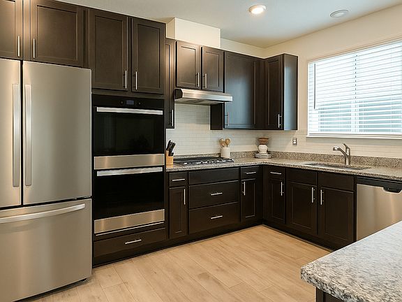 Downstairs: A private bedroom with a full bath creates the perfect guest space or option for multigenerational living. The open-concept layout connects the living and dining areas to a gourmet kitchen complete with double ovens, gas range, dishwasher, a large island, breakfast bar, stainless steel refrigerator, walk in pantry and abundant cabinet storage.