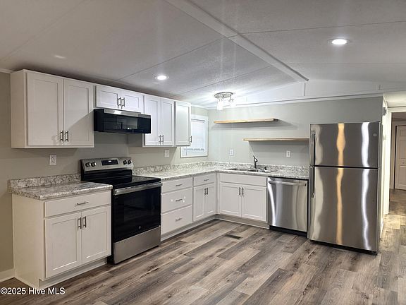 Welcome to your new home in Holly Ridge making commuting a breeze to either Jacksonville or Wilmington. This 2-bedroom, 2-bathroom manufactured home offers a spacious and open floorplan, perfect for modern living. The open kitchen is equipped with a stainless steel appliance package, adding a sleek and contemporary touch to the space. The split bedroom floorplan ensures privacy, making it ideal for various living arrangements. The primary bedroom is equipped with 2 deep closets and a beautiful ensuite with a double vanity sink and walk in ceramic tile shower. The home features LVP flooring throughout, combining durability with style. Washer and dryer included (as is). Lawn cutting included, freeing up your time to enjoy the nearby beautiful beaches. This home is a perfect blend of comfort, convenience, and style. No pets. Come and experience it for yourself!